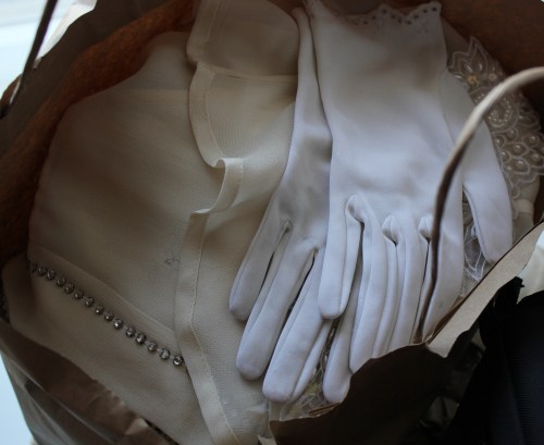 1940-1950 -luvun coutureompelimo Bertha Puiston poika oli etsinyt parasta tapaa varjella äitinsä muistoa ja hänen elämänsä aikana keräämiään aarteita. Berthan muotihuoneella oli aikanaan ollut yksi ompelija pelkästään paljettiperhosia varten:-). Berthan nukuttua pois hänen poikansa oli kuullut Tiia Vanhatapion rakkaudesta vintagevaatteisiin ja koruihin, ja lahjoittanut Tiialle osan äitinsä mittavasta kokoelmasta. Nyt Tiia puolestaan myi pois muutamia ihanuuksia, ja minä sain tilaisuuden antaa hyvän kodin pienille aplikaatioin koristelluille 40-luvun hanskoille ja helmipaljettisiipikoristeille, jotka ajattelin liittää johonkin hyvin selkeälinjaiseen valkeaan mekkoon tai paitikseen…