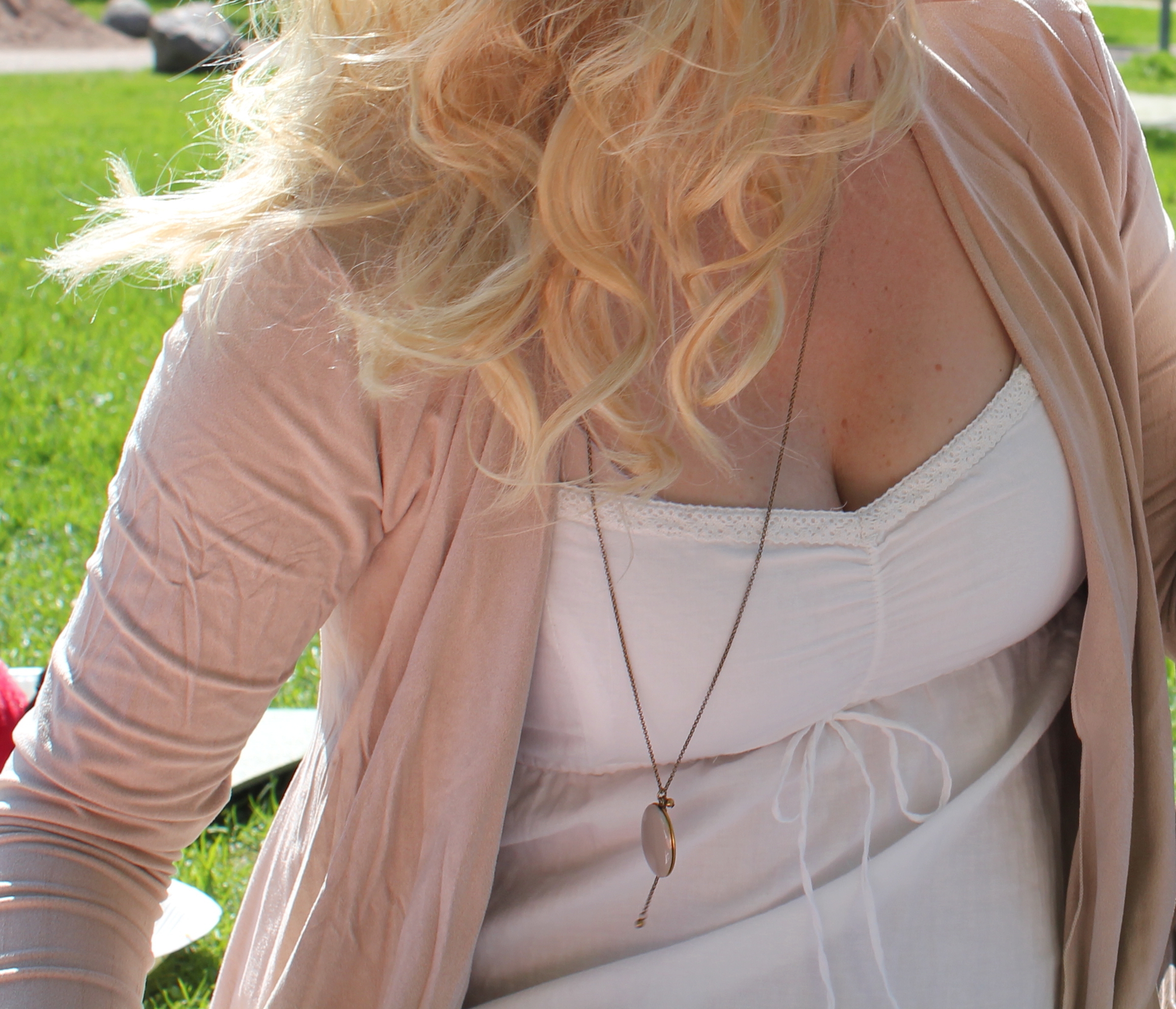 Sitten vielä se oleellisin eli päivän asu… Brodeerattu hellemekko H&M:n tämän kesän mallistosta, beige trikoo Férrer, medaljonki Nina’s, sormus Ranskasta antiikkimarkkinoilta.