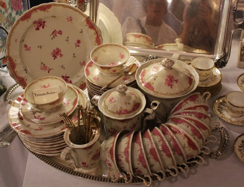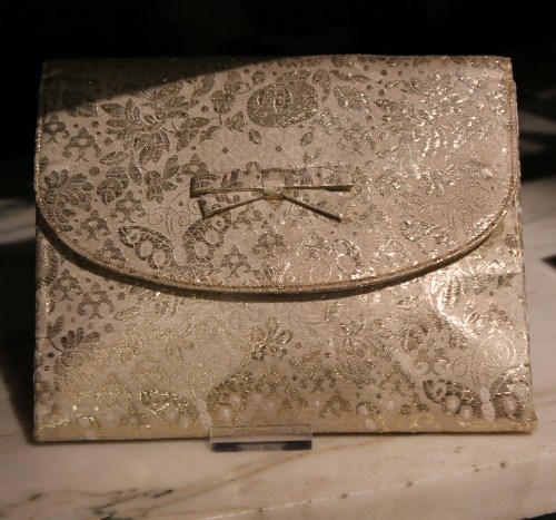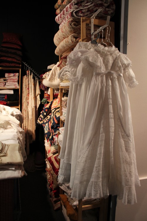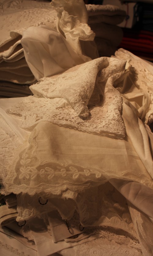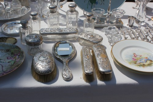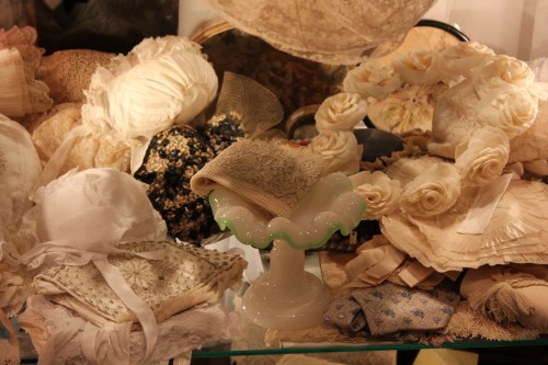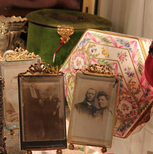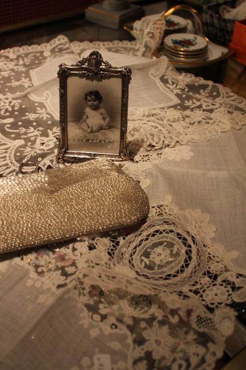 Pengoin onnellisena läpi pöytähopeat (tässä kylpyhuoneen antiikkinen hopeakristallisetti), pitsiliinat, vintagevaatteet ja art deco -korut.