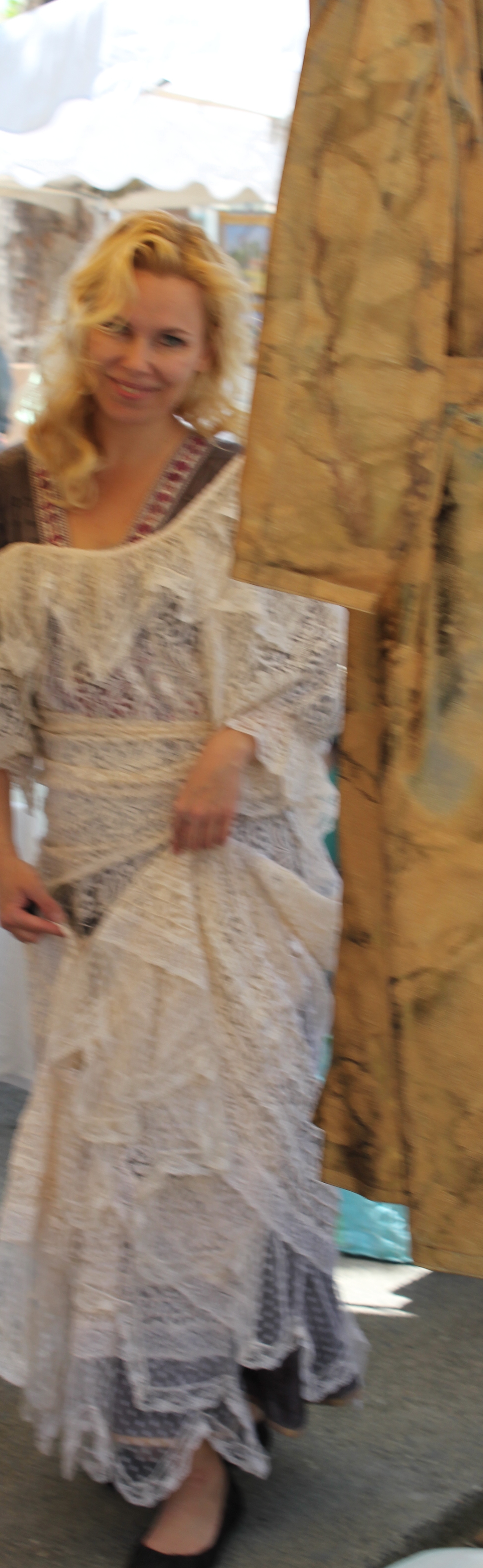 Voisikohan siitä irrottaa hihat ja laittaa tilalle sellaiset elegantit pitkät ja kapeat jotka jatkuisivat pitkinä kolmionmuotoisina kämmenen päälle, sitten vaikka nauhalla kiinni keskisormeen, vähän keskiaikaisen tyylisesti tiedättekö..