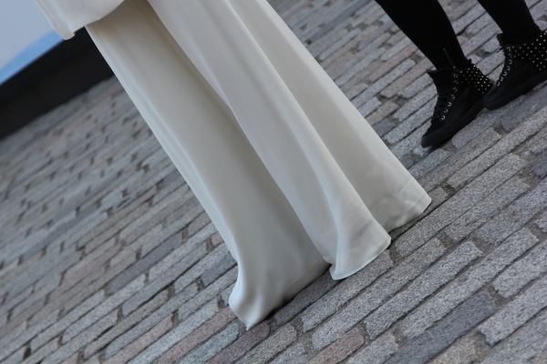 Okay, the dress was: shirt with satin ribbon under the chest, find from France, tweed skirt with lace detail Férrer, bag Chanel, Italian boots gift from Pipsa, silver bracelets handmade, gift from my dad when I was 6, from a Zambian silversmith. He gave them to me in adult size so I’d always remember that period of my life.
