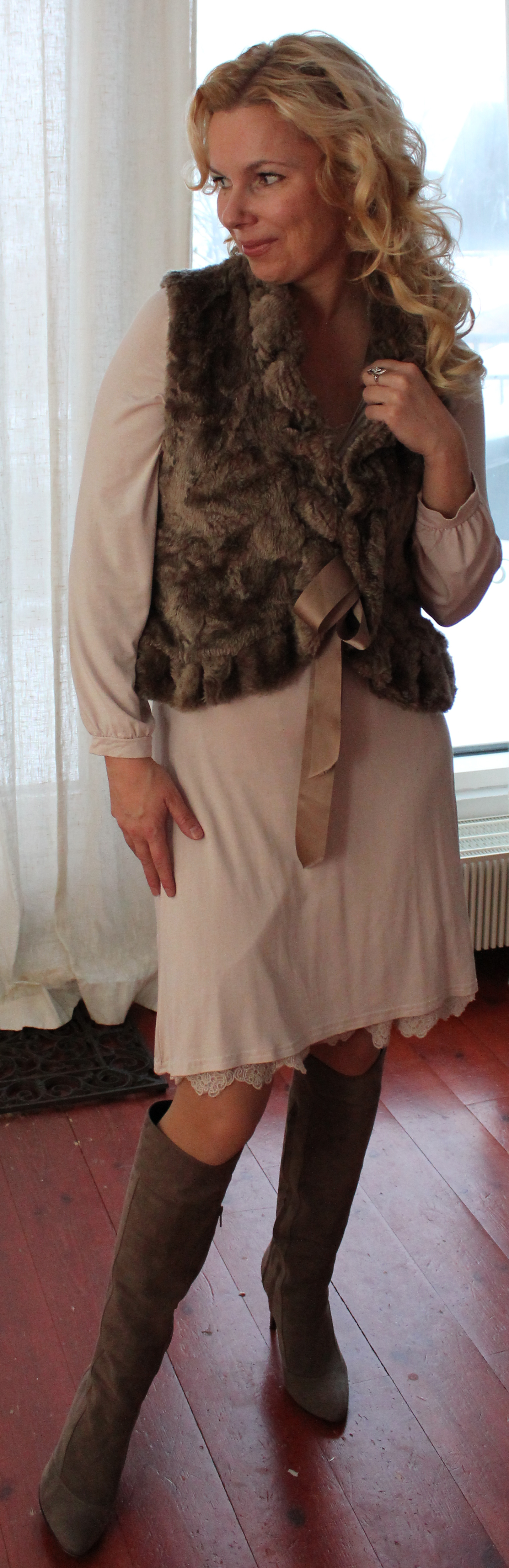 Unelmankevyt tekoturkisliivi satiininauhoilla on osa parhaasta kirpputorisaaliistani ikinä. Nukke-niminen stylisti teki tilaa vaatekaappeihinsa joten mm. viininpunaiset vintage-mokkasaappaat, vaalea tekoturkiskeeppi Play It Again Samista, hopeahiletoppi ja pari helmikoristeltua 20-luvun iltalaukkua löysivät hyvän kodin Krunikasta. Nukella oli myynnissä jopa aitoa Chanelia!